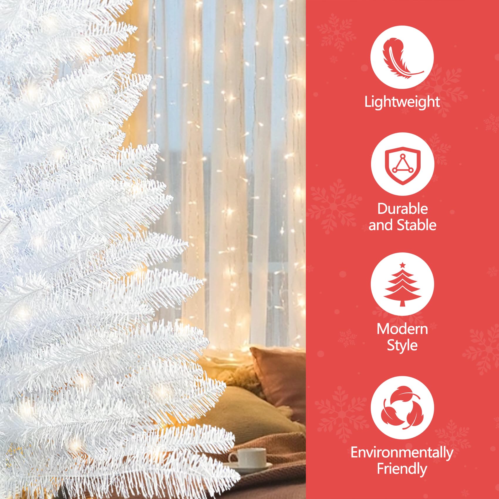 Bringstar Introducing a 4ft Small White Christmas Tree, a gothic-inspired elegance with 122 white tinsel branches. Made of premium PVC, it's flame-retardant and fade-resistant, with 50 UL-listed warm lights for a cozy glow. The separate packaging allows for custom setups, and its stable tripod base suits any space, from tabletops to entryways. Ideal for Halloween and Christmas, this compact tree adds unique charm to small areas in homes and offices.