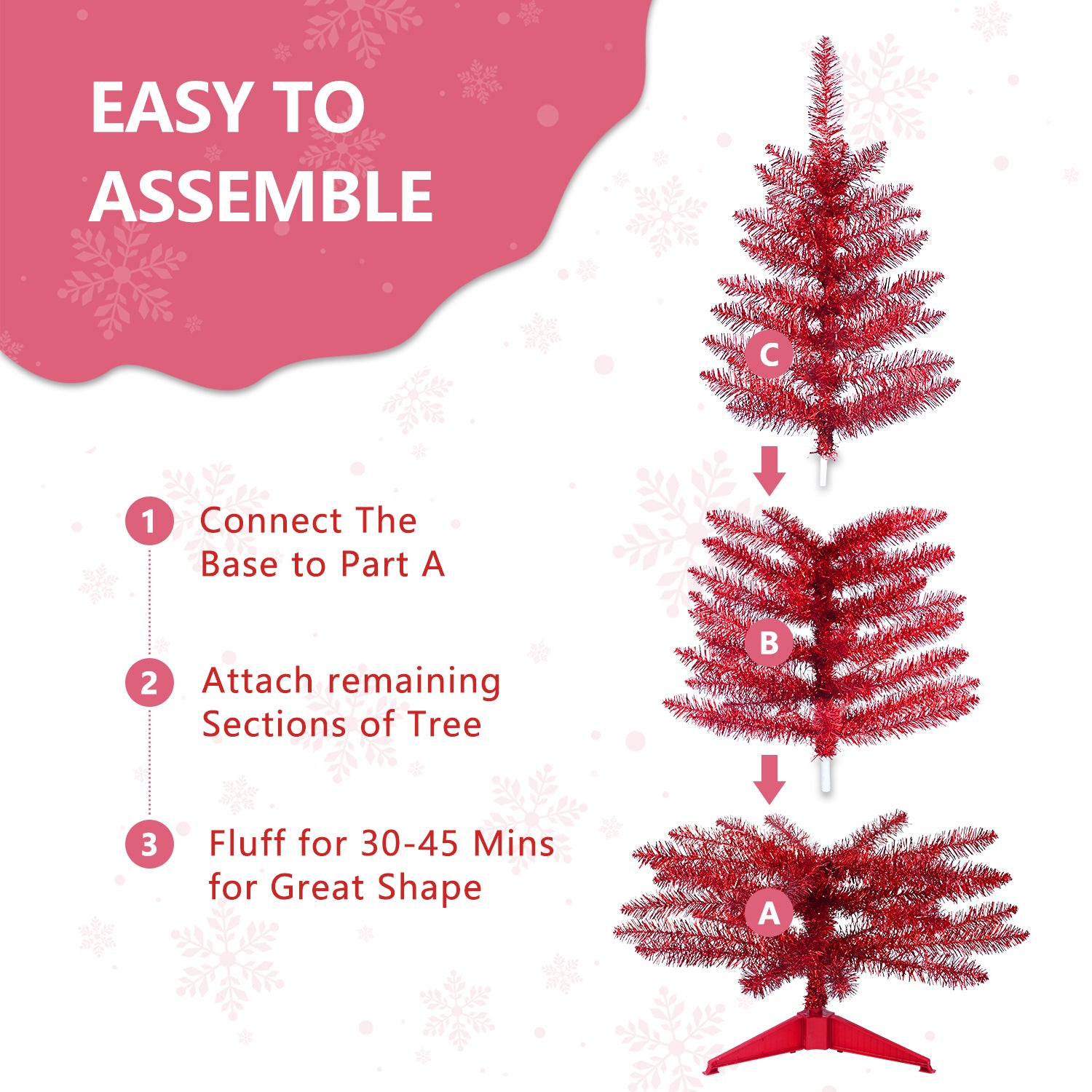 Bringstar 4FT Artificial Mini Red Christmas Tree with Lights, Lighted Christmas Tree with 50 Warm White Lights, Small Xmas Tree for Christmas Halloween House Decor, Red Tinsel