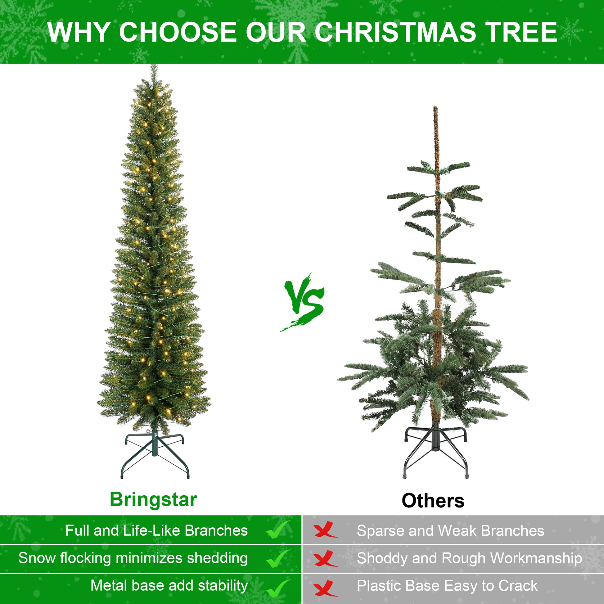 Bringstar, a brand dedicated to crafting exquisite Christmas trees, specializes in producing high-end artificial trees that boast unparalleled realism and fullness. 6ft Christmas tree crafted with 358 premium pvc branch tips, full appearance and life-like branches. Constructed from flame-retardant and non-allergenic materials, artificial Christmas tree provides a safer alternative to real trees. Allocating 30-60 minutes to properly fluff the branch tips will ensure a full and naturally-shaped Xmas tree. Pencil Christmas tree is ideal for placement in the center of the room or in a corner for space-saving decor. 150 UL-listed warm white LED lights illuminate your home with a festive glow, eliminating the time and effort of hanging lights on your tree. Hang ornaments, tinsel, ribbons, and any other decorations of your choice onto the branches. Besides, sturdy metal stand can provide greater support to improve the overall stability of green Christmas tree, ensuring you can enjoy it for many holiday seasons to come!